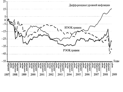 Ускорение инфляции в Украине привело к тому, что с конца 2007 г. РЭОК гривны стал устойчиво расти, сигнализируя об утрате отечественными товаропроизводителями своих ценовых преимуществ. Хотя соответствующие изменения происходили на фоне постепенной девальвации гривны, все же рост дифференциала уровней инфляции начал устойчиво превышать сопутствующие курсовые эффекты.