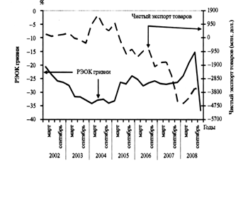 Рис. 3. Украина: динамика РЭОК гривны и чистого экспорта товаров в 2002-2008 гг. (1997 г. = 0%)