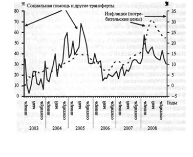 Рис. 4. Украина: темпы прироста потребительских цен, социальной помощи и других полученных населением трансфертов в 2003-2008 гг.