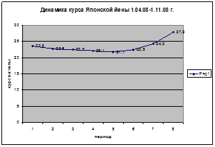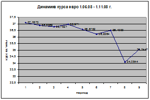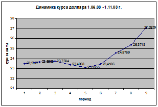 Валютой, которая постоянно скачет, является доллар. Если в начале года он стоил почти 24,5 рублей, в июле 2008 года он упал до 23,1 рублей, то сейчас он достиг 27 рублей [12]. «Учитывая сложившуюся ситуацию на международном валютном рынке, а также процессы, происходящие в экономике США, рассчитывать на устойчивую тенденцию к укреплению американской валюты в ближайшее время не приходится. Соответственно, на российском рынке, тенденция к укреплению рубля, вероятнее всего, также продолжится в связи с тем, что ЦБ сохранит курс на борьбу с ростом цен».