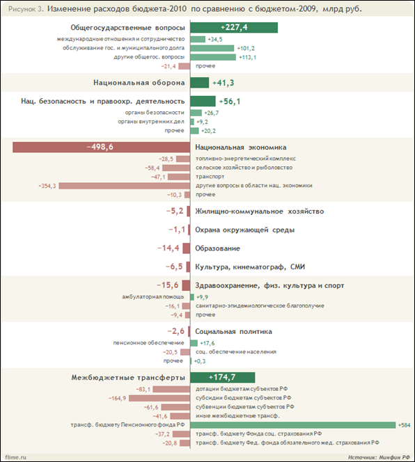 Общая картина ясна: расходы бюджета-2010 незначительно отличаются от расходов-2009. При этом в структуре бюджета-2010 значительно выросли показатели общегосударственных расходов и межбюджетных трансфертов (за счет увеличения трансфертов пенсионному фонду), а также умеренно выросли расходы на нац. оборону и нац. безопасность (+3,4% и +5,6%). При практически неизменном общем объеме расходов бюджета-2010 в сравнении с бюджетом-2009 для финансирования вышеприведенных увеличившихся расходов были значительно сокращены расходы на национальную экономику (-500 млрд, или -27%), трансферты другим бюджетам (кроме трансфертов пенсионному фонду РФ), а также умеренно (в пределах 4—9%) были сокращены другие статьи расходов: на ЖКХ, образование, здравоохранение, культуру и т. д.