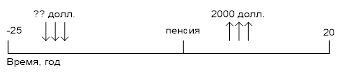 По схеме видно, что сумма накоплений должна быть равной сумме расходования, т.е. будущая стоимость аннуитета должна быть равна дисконтированной стоимости аннуитета. Пусть Х ежегодно вносимая предпринимателем сумма до пенсии, тогда