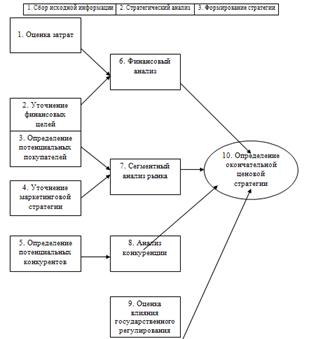 На политику цен большое влияние оказывают руководители службы сбыта, заведующие производством, руководители финансовых отделов, бухгалтерия. Поэтому вопросами разработки ценовой политики предприятия занимаются наряду с планово-экономическими службами и маркетинговые отделы. В составе основных элементов ценовой политики предприятия присутствуют блоки, представляющие собой этапы маркетинговых исследований [18, с. 156]. Алгоритм построения ценовой стратегии на предприятии можно представить в следующей последовательности: