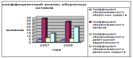 Анализ оборотных активов предприятия свидетельствует о снижении основных показателей в 2007-2008г.г. В связи со снижением коэффициентов оборачиваемости оборотных средств в целом финансовое состояние предприятия значительно ухудшилось, что плохо влияет на деловую активность предприятия. Динамика представлена в виде диаграммы (см. рисунок №1). На основе расчетов можно сделать вывод, что произошло уменьшение оборачиваемости дебиторской задолженности, которое говорит об ухудшении платежной дисциплины покупателей и показывает относительное увеличение коммерческого кредитования. Снижение этого показателя свидетельствует об ухудшении управления дебиторской задолженностью. Увеличение дебиторской задолженности возможно по следующим причинам: проведение неосмотрительной политики предприятия по отношению к покупателям; неразборчивый выбор партнеров; неплатежеспособность контрагентов; наращивание объема продаж; трудности в реализации продукции.
