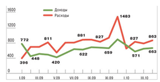 Рис. 3.1. Доходы и расходы федерального бюджета в 2009-2010 годах (млрд. руб.).