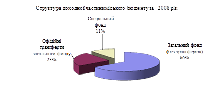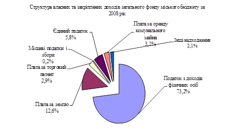 За 2008 рік до загального фонду міського бюджету надійшло (без офіційних трансфертів) 363285,4 тис.грн. власних та закріплених доходів, що становить 97,4 відс. до уточненого річного завдання.