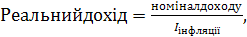 Спочатку нагадаємо значення окремих економічних показників. Номінальний дохід (Я<3 - номінальна сума отриманої зарплати, виплати процентів на заощадження, виплати прибутку, дивідендів, рентних платежів тощо. Реальний дохід (ф - кількість товарів і послуг, що їх можна придбати на суму номінального доходу. Динаміка реального доходу визначається як різниця між номінальним доходом та рівнем цін (інфляцією). Якщо за рік середній показник номінального доходу зріс на 15%, а ціни за той самий час - на 10%, то можна вважати, що реальні доходи населення збільшилися на 5%.