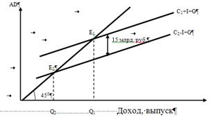 Как видно из рисунка, расстояние между Q2 и Q1 больше, чем разница по вертикали между прямыми С1 +I+G и С2 +I+G, т.е. больше 15 млрд. р., что свидетельствует о наличии мультипликатора налогов. Он меньше мультипликатора государственных расходов. Это объясняется тем, что изменение государственных закупок на одну денежную единицу приводит к такому же изменению совокупного спроса, а изменение аккордного налога на денежную единицу сопровождается изменением совокупного спроса на величину MPC*1. Поэтому налоговый мультипликатор МT будет равен: