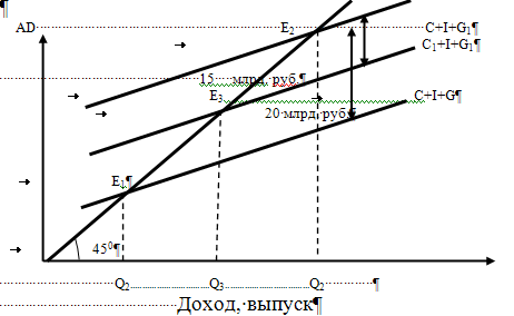 Введение аккордного налога величиной 20 млн. р. сдвинет кривую С+I+G1 вниз, в положение С1 +I+G1 . Сдвиг произойдет на величину 15 млн. р., так как мультипликатор налогов меньше мультипликатора расходов. Точка равновесия переместится из Е2 в Е3 , а объем производства уменьшится с Q2 до Q3 . Объем производства в результате введения налога сократится на