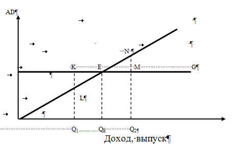 Этот процесс будет продолжаться до тех пор, пока не наступит равенство между совокупным спросом и объемом выпуска. Новое положение равновесия будет достигнуто в точке Е1 при выпуске Q2 . Увеличение государственных закупок стимулировало рост объема производства с Q1 до Q2 .