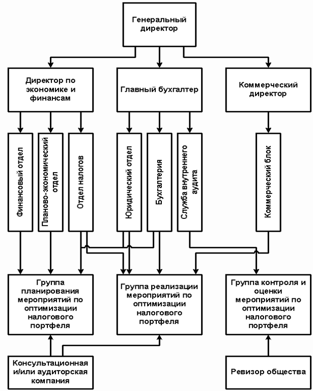 | Директор по экономике и финансам | Канцелярия и все отделы группы реализации | Распоряжение о создании группы реализации | Учредительный документ группы реализации мероприятий по оптимизации налогового планирования |