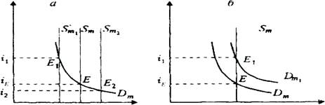Предложение денег контролирует центральный банк как путем денежной эмиссии, так и посредством управления процессом создания денег коммерческими банками. Он определяет необходимое количество денег исходя из состояния экономики страны вне связи с уровнем процентной ставки. Поэтому кривая предложения денег Sm представляет собой вертикальную линию, перпендикулярную оси абсцисс в точке, соответствующей количеству денег в стране (рис.1.3,a).