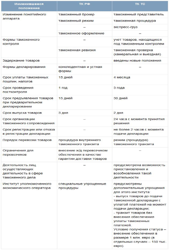 В целом положения ТК ТС остались аналогичны положениям Таможенного кодекса РФ. Но перечислить основные изменения и нововведения ТК ТС будет полезно. Для этого представлена таблица 2.1