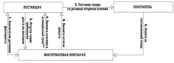 Схема факторинга выглядит достаточно просто (Рис.1). Поставщик отгружает продукцию покупателю на условиях отсрочки платежа. Накладные передаются в факторинговую компанию. Она в свою очередь платит компании по накладным за отгруженный товар от 50% до 95% долга покупателя (размер этой суммы зависит от величины сделки, продолжительности отсрочки оплаты, рисков, связанных с работой клиента, и количества отгружаемого товара). Позже покупатель переводит на счет факторинговой компании деньги в размере стоимости товаров, поставленных компанией на условиях отсрочки платежа. После этого факторинговая компания переводит остаток суммы поставщику. [2]