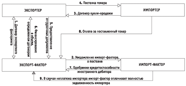 Кроме того, экспортер вынужден подстраховываться на случай резкого скачка курса валют. Используя факторинг, экспортер получает значительную часть от стоимости проданного товара сразу после отгрузки, таким образом снимая с себя валютный риск. Международный факторинг может осуществляться и без посредничества импорт-фактора, в этом случае схема взаимодействия контрагентов аналогична классическому факторинговому взаимодействию. [9]