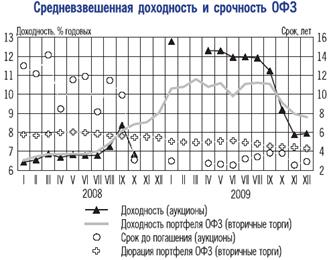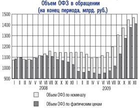 В январе-апреле в условиях сохранявшейся нестабильности на российском финансовом рынке спрос участников рынка ОФЗ был крайне низким. В январе гособлигации на аукционах покупали лишь крупнейшие консервативные инвесторы. В феврале эмитент был вынужден отменить 2 аукциона, а в апреле признать 2 аукциона несостоявшимися. С мая в условиях роста банковской ликвидности ситуация на первичном рынке стала улучшаться, и до июля наблюдался устойчивый, но весьма умеренный спрос на размещаемые выпуски ОФЗ. С июля спрос стал расти, достигнув максимума в октябре, а затем, несколько снизившись, сохранялся на достаточно высоком уровне до конца 2009 года. На вторичном рынке в 2009 г. периодически проводились аукционы по доразмещению гособлигаций. До начала сентября эмитент размещал гособлигации на аукционах преимущественно с премией к их доходности на вторичном рынке, а затем со значительным дисконтом.