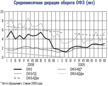 Дюрация портфеля ОФЗ в 2009 г. снизилась (рис.2), т.к. эмитент в условиях роста стоимости заимствований сократил сроки привлечения средств для ограничения расходов на обслуживание облигационных займов.