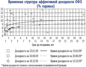 Размах колебаний доходности рыночного портфеля ОФЗ в 2009 г. составил 3,0 процентного пункта (в 2008 г. – 3,1 процентного пункта).В январе-июне доходность кратко- и среднесрочных ОФЗ росла быстрее, чем доходность долгосрочных гособлигаций. При этом доходность почти не зависела от срочности инструментов. К концу декабря кривая доходности стала возрастающей и заметно сместилась вниз (рис.7).