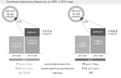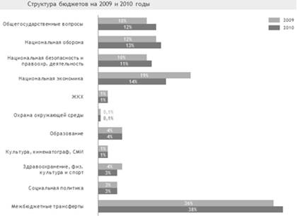 Общая картина ясна: расходы бюджета-2010 незначительно отличаются от расходов-2009. При этом в структуре бюджета-2010 значительно выросли показатели общегосударственных расходов и межбюджетных трансфертов (за счет увеличения трансфертов пенсионному фонду), а также умеренно выросли расходы на нац. оборону и нац. безопасность (+3,4% и +5,6%). При практически неизменном общем объеме расходов бюджета-2010 в сравнении с бюджетом-2009 для финансирования вышеприведенных увеличившихся расходов были значительно сокращены расходы на национальную экономику (-500 млрд, или -27%), трансферты другим бюджетам (кроме трансфертов пенсионному фонду РФ), а также умеренно (в пределах 4—9%) были сокращены другие статьи расходов: на ЖКХ, образование, здравоохранение, культуру и т. д.