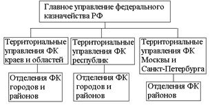 Федеральное казначейство – это единая централизованная система органов исполнительной власти, включающая органы по субъектам РФ и субъектам местного самоуправления. Органы казначейства являются юридическими лицами, имеют самостоятельные сметы расходов, текущие счета в учреждениях банков для ведения хозяйственных операций. Единую централизованную систему органов казначейства возглавляет начальник Главного управления Министерства финансов РФ в ранге заместителя министра. Структура управления федеральным казначейством представлена в приложении 2.