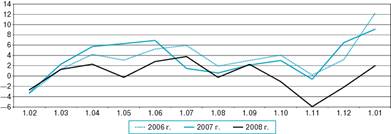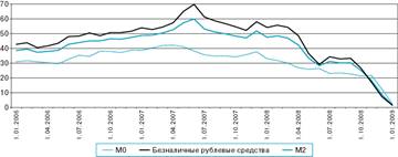 Темп прироста безналичной составляющей денежной массы М2 в 2008 г. составил 1,3% (за 2007 г. — 54,1%). В то же время темпы прироста в I и IIкварталах 2008 г. были соответственно примерно в 2 и 3 раза ниже, чем в 2007 г., а в III и IVкварталах средства на рублевых банковских счетах сократились в абсолютном выражении (на 0,5% и 7,4% соответственно).