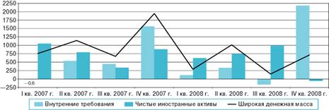 Прирост широкой денежной массы за 2008 г. составил 2138,0 млрд. руб., или 14,6% (за 2007 г. — 4487,3 млрд. руб., или 44,2%). При этом по сравнению с 2007 г. уменьшился как прирост чистых иностранных активов (2294,5 против 3042,1 млрд. руб.), так и прирост внутренних требований (2461,9 против 2526,7 млрд. руб.).
