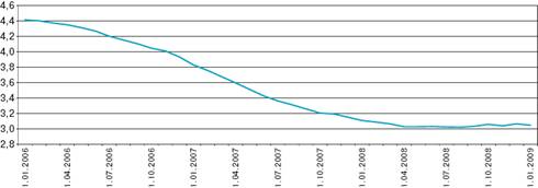 По итогам 2008 г. денежная масса М2 увеличилась на 1,7%, тогда как за 2007 г. ее рост составил 47,5%. При этом в отличие от предыдущих лет в IV квартале 2008 г. наблюдалось сокращение денежного агрегата М2 на 6,1%. Соотношение темпов роста потребительских цен и денежного агрегата М2 в 2008 г. обусловило сокращение рублевой денежной массы в реальном выражении на 10,3%, тогда как в 2007 г. ее реальный рост составил 31,8%.[7]