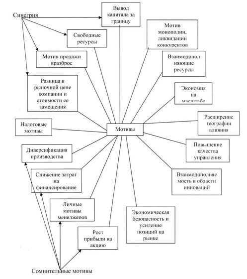 Анализируя мировой опыт и систематизируя его, можно выделить различные основные мотивы слияний и поглощений компаний (рисунок 1.1).