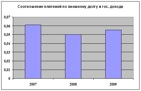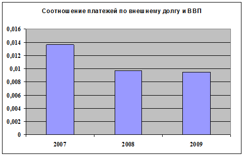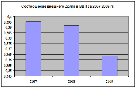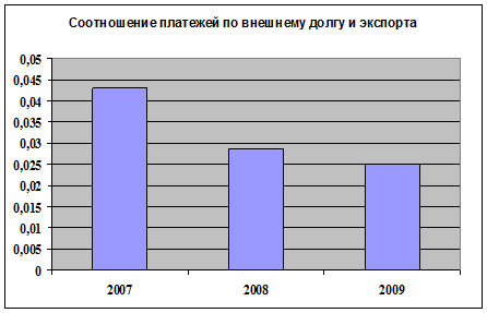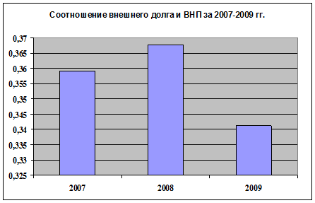 Данный показатель используется Мировым банком для определения государств с большим уровнем задолженности. В нашем случае данное значение за период 2007-2009 гг. не превышает отметку 48%, это говорит о том, что наша страна относится к третьей группе – “страны с небольшой задолженностью” (рисунок 2).