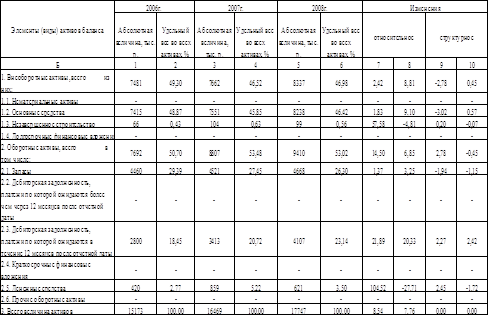 За три анализируемых года в составе активов предприятия произошли изменения (табл. 1). Общая величина активов увеличилась в 2007 году на 8,54 % и в 2008 году на 7,76 %. Это является положительной тенденцией в деятельности предприятия. Это говорит о росте хозяйственного оборота. Наибольший удельный вес в составе активов занимают оборотные активы, хотя и ненамного превышают долю внеоборотных. Это также является свидетельством хорошего баланса.