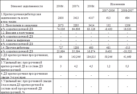Так на конец 2006 года просроченная дебиторская задолженность составила 84 000 р. (3%), на 2007 год – 143 346 р. (4,2%), в 2008 году – 184 815 р. (4,5%). Таким образом за анализируемый период просроченная дебиторская задолженность возросла на 1,5%.