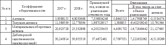 Факторный анализ проводился путем использования метода цепных подстановок (табл. 15). На основе произведенных расчетов были получены следующие результаты: общее изменение коэффициента оборачиваемости активов в 2008 году по сравнению с 2007 годом составило 0,86. При этом за счет увеличения объема реализации коэффициент оборачиваемости увеличился на 1,42, а увеличение стоимости активов привело к снижению оборачиваемости на 0,55.