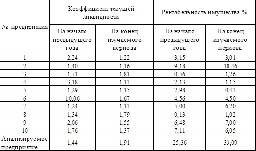 | № предприятия | Коэффициент текущей ликвидности | Рентабельность имущества, % | ||