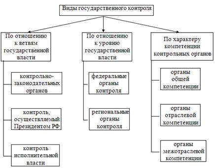По отношению к ветвям государственной власти выделяют: контроль законодательных (представительных) органов государственной власти, как непосредственно (парламентский контроль), так и через специально созданные органы контроля (например, Счётная палата), президентский контроль и контроль, осуществляемый органами исполнительной власти.