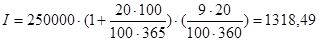 По грошовому зобов'язанню через 100 днів повинна бути сплачена сума 250000 грн. з відсотками, які нараховуються виходячи з 20 % річних при кількості днів у році, рівній 365. Банк урахував зобов'язання за 20 днів до настання строку погашення по обліковій ставці 9 % річних при розрахунковій кількості днів у році, рівній 360. Визначити суму дисконту, отриманого банком.