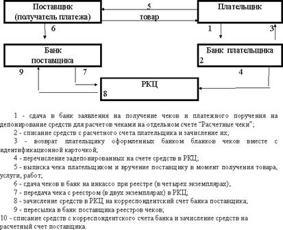 Документооборот при расчетах чеками сводится к следующему. Чекодатель в случае приобретения товаров, услуг выписывает расчетный чек, проставляя в нем следующие данные: