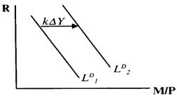 где коэффициенты k и h отражают чувствительность спроса к доходу и к ставке процента. Функция спроса на деньги показывает, что при любом данном уровне дохода величина спроса будет падать с ростом ставки процента и наоборот. Увеличение уровня дохода отразиться сдвигом кривой спроса на деньги LD вправо на величину k∆Y (см. рисунок 1.1).
