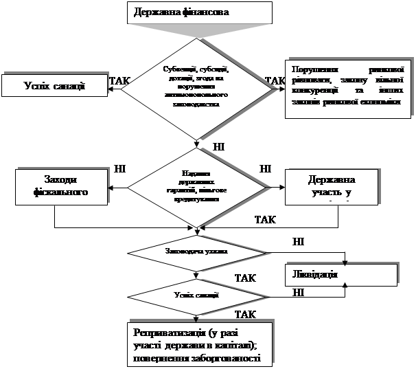 Отже, можна зробити висновок щодо браку прямих фінансових відносин між державою й підприємствами, що робить недоцільним розгляд на рівні державних санаційних органів питання про надання кредитної підтримки конкретним суб'єктам господарювання.