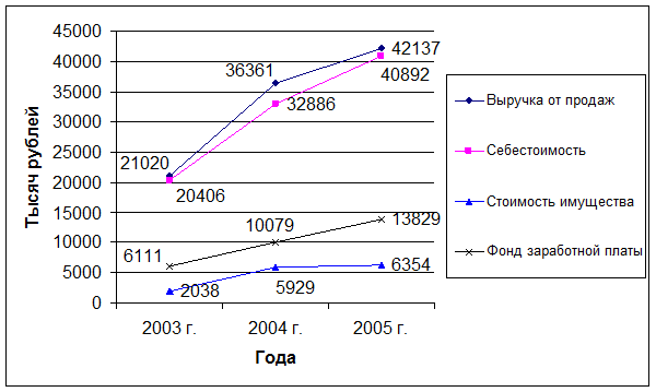 Чистая прибыль в 2005 г. возросла в 2,5 раза или на 850 тыс. руб., по сравнению с 2003 г. Стоимость имущества, за аналогичный период увеличилась на 4316 тыс. руб. или в 3,1 раза.
