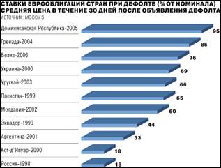 Как следует из расчетов Moody’s, дефолт Украины в 2000 году был не самым чувствительным для инвесторов. Аналитики Moody’s сравнивают средние котировки еврооблигаций, по которым предъявлялся дефолт, в течение 30 следующих дней после объявления дефолта: например, с точки зрения институциональных инвесторов, отказ Аргентины от обслуживания внешнего долга в 2001 году был менее болезненным, чем в России тремя годами раньше, а так плохо платил инвесторам лишь Кот-д’Ивуар (рис. 1):