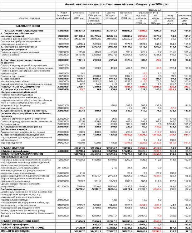 У 2004 році при плановому показнику 850271,7 тис.грн. фактично надійшло до міського бюджету 827685,8 тис.грн , що склало -22585,9тис.грн. відхилення від плану, а саме на 97,3%.