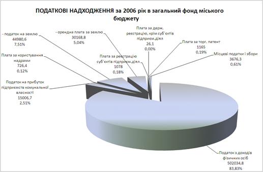 У 2006 році при плановому показнику 1396941,8 тис.грн. до бюджету надійшло 1351588,0 тис.грн., що склало –45353,8 тис.грн. відхилення від плану, що склало 96,8%.
