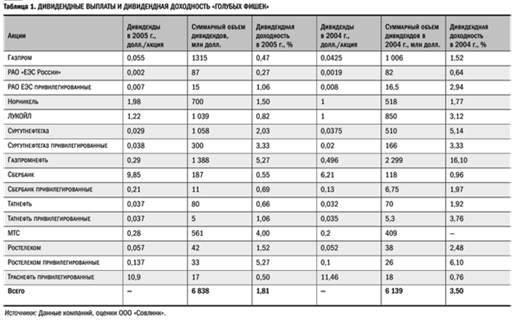 В последние годы дивидендная политика крупного бизнеса приближается к стандартам корпоративного управления, принятым на Западе. Проводниками этих стандартов традиционно являются «голубые фишки», но в 2006 г. некоторые компании «второго эшелона» сделали значительные шаги на пути приближения к мировым стандартам дивидендной культуры, обозначив минимальную долю чистой прибыли, направляемую на дивидендные выплаты, в размере 15% (ММК, НОВАТЭК) (табл. 1).