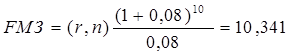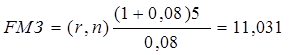 500*FMЗ (8%,5)*(1+0,08)=500*11,031*1,08 =5956,74 руб.(сумма начисляемая раз в 1 год.)