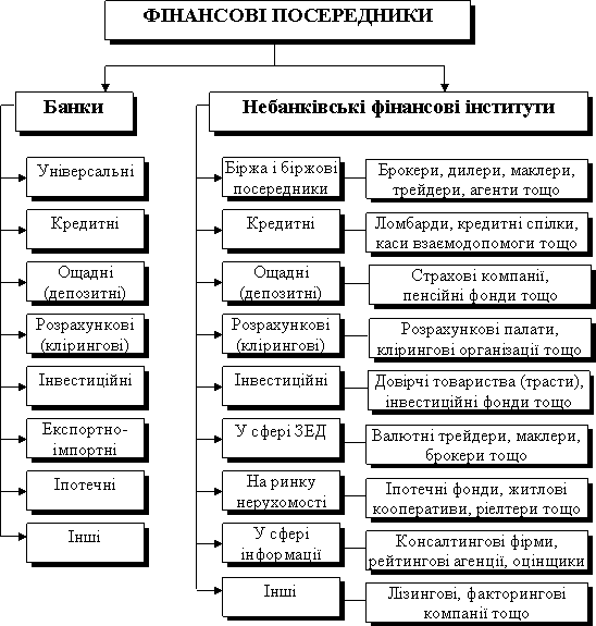 У вітчизняній літературі найпоширенішим є поділ фінансових посередників на дві групи: