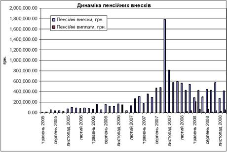 За перший квартал 2009 року до фонду надійшло пенсійних внесків на суму 428 931,15 грн., та було зроблено пенсійних виплат на суму 293 784,32 грн.