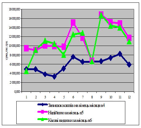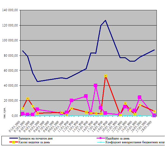 Так, ми бачимо, що залишок коштів на початок дня знаходиться в межах 45─85 млн. грн. і лише незабаром перевищує позначку 120 млн. грн. При цьому нагальної необхідності в таких ресурсах не має, оскільки рівень видатків ледве досягає позначки 20 млн. грн. і, навіть, в самий напружений (з точки зору потреби в коштах) день ─ складає приблизно 53 млн. грн.
