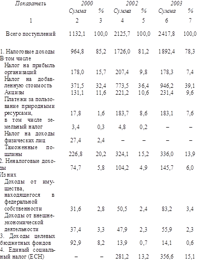 Общая структура доходов федерального бюджета в 2000 – 2003гг. представлена в табл. 2. (См. Приложение)