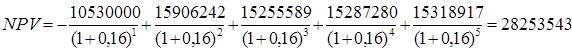 | Чистые денежный поток (ЧДП) | 0 | 15 906 242 | 15 255 589 | 15 287 280 | 15 318 971 |