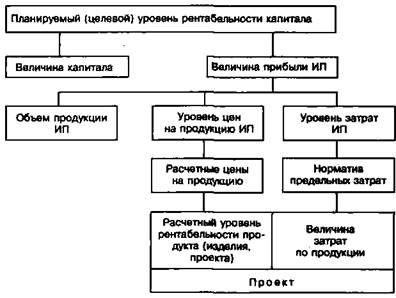 Предплановый анализ . В процессе управления анализ предшествует принятию решений. В области управления затратами плановые решения означают установление конкретных значений ожидаемых затрат, соответствующих целевым (заданным) результатам. Переход при планировании от задач ИП к задачам исполнителей осуществляется не только в разрезе подразделений (центров ответственности и др.), но и по всем продуктам (проектам, изделиям). Принципиальная схема трансформации целевых показателей рентабельности ИП в показатели рентабельности и затрат проекта дана на рис. 1.